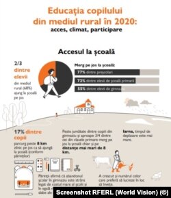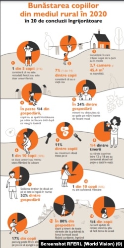 „De Ziua Internațională a Copilului, aș dori să aduc în atenția publică doar câteva date despre copiii din mediul rural care ar trebui să ne mobilizeze ca cetățeni, părinți, dar și ca autorități responsabile: 21% dintre copii consideră că nu sunt decât uneori sau niciodată fericiți, 10% din copii se duc seara în pat flămânzi la culcare, 17% din copiii parcurg peste 8 km zilnic pe jos ca să ajungă la şcoală, după cum arată datele extrase din Raportul de bunastare a copilului din mediul rural, 2020 raport efectuat de Fundația World Vision România”, spune Gabriela Paleru, Advocacy Director la World Vision România într-un interviu acordat pentru Europa Liberă.