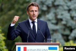 Macron a vorbit la o conferință de presă după ce s-a întâlnit cu omologul său ucrainean, Volodimir Zelenski, alături de cancelarul german Olaf Scholz, premierul italian Mario Draghi și președintele României Klaus Iohannis.