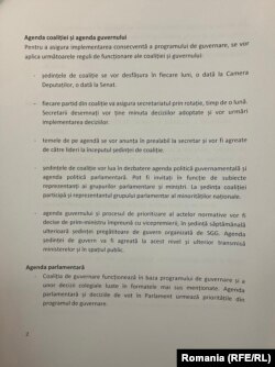 De asemenea, Coaliția, premierul și membrii guvernului „își asumă să nu adopte poziții publice prin care să submineze activitatea și agenda guvernamentală și a membrilor guvernului. Comunicarea publică se va face în spirit de susținere reciprocă și solidaritate".