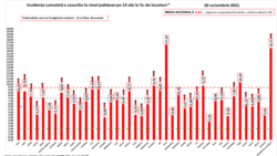 Cea mai mare incidență a cazurilor este în continuare în Ilfov, unde rata a ajuns miercuri la 17,14 cazuri la mia de locuitori. Urmează Bucureștiul cu o incidență de 16,51. Niciun județ nu are incidență sub 3 / 1.000.