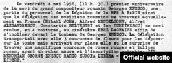 La împlinirea unui an de la moartea lui Enescu, la Paris sosea și o delegație importantă de muzicieni români (Mihail Jora, Alfred Mendelsohn, Alfred Alessandrescu, Constantin Silvestri, Ion Dumitrescu etc.), care avea „surpriza să găsească - se notează în alt document inedit din arhiva Europei Libere - o splendidă coroană de trandafiri roșii și lalele roz, avînd un ruban mov și inscripția următoare: „IN MEMORIAM GEORGE ENESCU RADIO EUROPA LIBERĂ - VOCEA ROMÂNIEI LIBERE.”