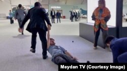 Tânărul activist a fost târât prin sală, apoi spune că a fost închis într-o cabină de toaletă timp de mai bine de o oră împreună cu un agent de securitate, în timp ce autoritățile decideau ce să facă.