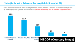În varianta în care Gabriela Firea nu mai candidează din partea PSD, iar din zona de centru-dreapta intră în cursă Sebastian Burduja și Nicușor Dan, câștigător va fi tot independentul Popescu Piedone.