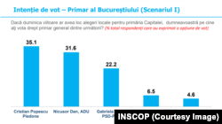 - Cristian Popescu Piedone, ex-primar de sector PSD, acum independent, câștigă în toate variantele, indiferent de contracandidat, având scoruri mai mari decât Nicușor Dan, Gabriela Firea sau Sebastian Burduja;