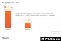 Iar mai prost decât România stau Croația, Ungaria și Bulgaria, arată datele Eurostat. Decalajele față de restul UE nu se opresc aici. Un studiu al companiei de cercetare de piață GfK arăta de pildă că, în 2017, puterea medie de cumpărare a cetățenilor UE era de peste 16.400 de euro.