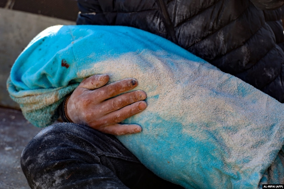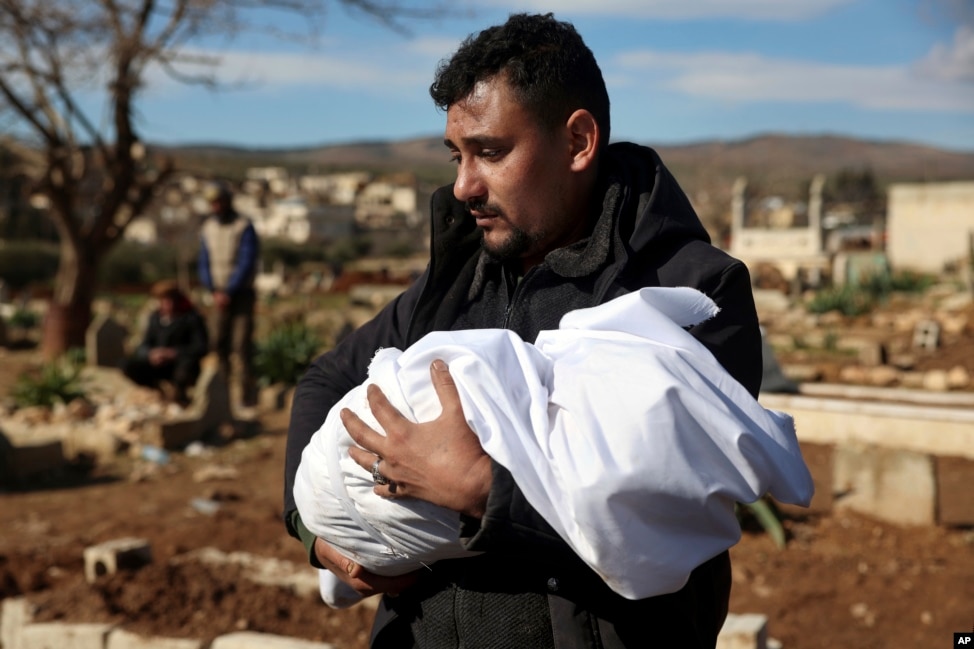 Un bărbat ține în brațe cadavrul copilului său scos din dărâmături în orașul Harim, în provincia Idlib, nord-vest, controlată de rebeli ai Siriei, la granița cu Turcia, la 8 februarie 2023, la două zile după un cutremur mortal care a lovit Turcia și Siria.