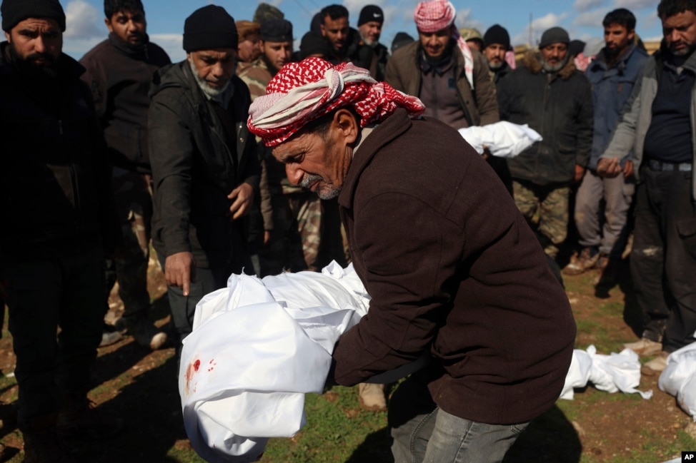 Rudele și cei apropiați îngroapă membrii familiei care au murit într-un cutremur devastator care a zguduit Siria și Turcia într-un cimitir din orașul Jinderis, provincia Alep, Siria, marți, 7 februarie 2023. .