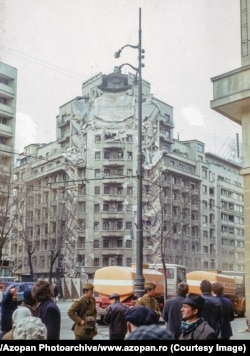 Această imagine, a unui bloc de apartamente grav avariat din centrul Bucureștiului, a fost realizată pe 6 martie 1977, la două zile după ce un cutremur a devastat o mare parte din România.