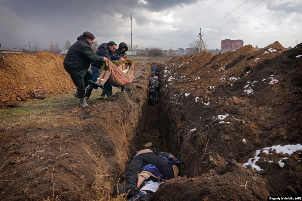 9 martie 2022, Mariupol: Morții sunt depuși într-o groapă comună.