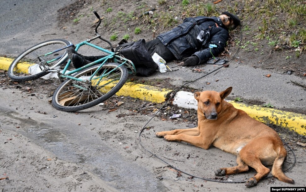 3 aprilie 2022, Bucea: Câinele care nu și-a abandonat stăpânul char și după ce acesta a fost împușcat în stradă și abandonat acolo de către trupele ruse.