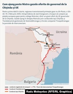 Oficialul Energocom a explicat Europei Libere că de pe piața românească sunt cumpărate pentru regiunea transnistreană doar 1 milion de metri cubi de gaze pe zi, pentru că o cantitate mai mare nu ar încăpea în conducta Iași-Chișinău, pe unde sunt deja importate gaze pentru consumul din dreapta Nistrului.