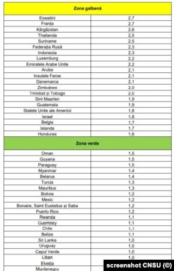 De asemenea, Franța, Belgia, Israel, SUA, Islanda, Honduras, Aruba și Sint Marteen trec din zona verde în cea galbenă în urma creșterii incidenței, iar Suriname și Insulele Feroe din cea roșie în cea galbenă, în urma scăderii incidenței.
