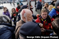 UPDATE: Jandarmeria l-a identificat pe agresorul lui Gelu Voican Voiculescu. Este vorba de un bărbat de aproximativ 65 de ani, fără antecedente violente la adunările publice, care l-a lovit în cap cu un baston ortopedic pe Voiculescu. Bărbatul este acum căutat de poliție.