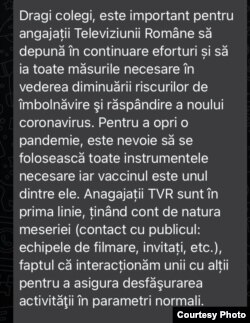 În privința campaniei de vaccinare însă, lucrurile sunt mult mai clare. Toți angajații TVR se pot înscrie pentru vaccinare, prin departamentele lor: