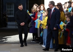 Prim-ministrul britanic Keir Starmer și președintele ucrainean Zelenski au fost întâmpinați de școlari ucraineni la sosirea lor la sediul ministerului.