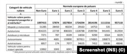INS spune că în România sunt în circulație 7,3 milioane autoturisme, din care 3,9 milioane Euro4 și Euro3 și 1,7 milioane Euro5 și Euro6. Standardul Euro3 a apărut în 2000, iar România are 1,6 milioane de mașini mai vechi de atât, așadar 3 milioane de mașini mai vechi de 15 ani, aproximativ jumătate din parcul auto. Vehiculele rutiere clasificate în conformitate cu Normele europene de poluare, înmatriculate în circulație, cuprindeau, la sfârșitul trimestrului I 2021, în proporție de 55,5%, vehicule cu normele de poluare Euro 4, Euro 5 sau Euro 6 și în proporție de 12,5%, vehicule cu norma de poluare Non-Euro.