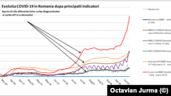 Octavian Jurma: „Chiar mă uitam la cifrele de astăzi și e genul acela de lucru în care speri să nu ai dreptate. Mă bazez pe două surse. O dată, din caracteristica indicatorilor folosiți. Definiția indicatorului se referă la o rată cumulată de cazuri de 14 zile. Deci, practic, indicatorul trebuie să aștepte să se acumuleze cazurile în 14 zile și se măsoară. Iar acesta este un indicator în primul rând tardiv, pentru că abia peste 14 zile încep să adune suficiente date. Și, doi, este lent. Inerția lui este mare. Chiar am urmărit și am și un grafic pe care nu l-am publicat încă (v.foto). Dar am și un indicator pe termen scurt, care se uită la evoluția pe trei zile, care urcă și coboară în interiorul în interiorul săptămânii, în funcție de numărul de teste și arată curba cazurilor: sus-jos, sus-jos. Miercuri-joi avem vârfurile. Acum nu mai avem coborârea aceea pe care o aveam în weekend, ceea ce arată clar că nu mai au unde să se ducă cazurile. Ei au cam întins cazurile pe săptămână cum întinzi untul pe felie să nu fie chiar așa vârfuri mari, dar la un moment dat nu mai ai unde să le pui că s-au umplut și, practic, dispar coborârile acelea la care ne așteptam noi în weekend. Și asta a fost și o caracteristică și a valorii din iulie. Adică am început să avem acele recorduri unul după altul: la început numai miercuri și joi, după aceea miercuri, joi și vineri. Iar acum mă uit: săptămâna trecută au fost patru recorduri consecutive, nu trei, și atunci săptămâna aceasta mă aștept să fie chiar mai dramatică decât cea care a trecut. Acest indicator pe termen scurt a fost mereu pe roșu. În timp ce indicatorul pe termen lung, această incidență la o mie sau la o sută de mii, cum e folosită în UE și SUA, s-a menținut în jurul a 0,9 sau 90 mult timp. Asta, și datorită faptului că noi am avut un platou de teste. Din păcate, noi nu am mărit capacitatea de testare, cum au procedat celelalte țări în care incidența e mult mai mare decât la noi, dar ați văzut că mortalitatea e mică. Explicația e mai simplă, că medicii la noi își fac la fel de bine treaba.”