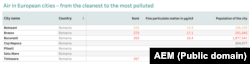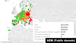 Noul instrument pus la dispoziție de AEM analizează prezența particulelor în suspensie fine PM2.5, în ultimii doi ani, iar orașele sunt incluse într-un top: de la cel mai puțin poluat (orașul Umeå din Suedia), la cel mai poluat, Nowy Sącz din Polonia (locul 323).