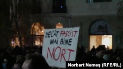 Tinerii au afișat și pancarte cu mesajul „jos legionarii”, cu trimitere la declarațiile făcute de Călin Georgescu la o serie de televiziuni din România în care și-a afirmat susținerea și simpatia pentru mișcarea legionară din România și liderii ei.