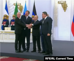 Vladimir Putin și reprezentanți ai separatiștilor din regiuni ucrainene pe care le revendică Rusia la ceremonia în care au fost semnate decretele de anexare.