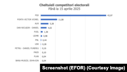 - AUR a plătit toții banii, adică 5,2 milioane de lei pentru tipărituri (Broşuri, pliante şi alte materiale de propagandă electorală tipărite). Cu toate acestea, este neverosimil ca partidul să nu fi cheltuit bani pentru online. EFOR a raportat că AUR a cheltuit bani pentru promovarea unor reclame politice de la începutul campaniei (vezi rapoartele de mai sus). Doar pagina oficială a lui George Simion a cheltuit pentru 9 reclame 40 de mii de lei între 8 Apr – 14 Apr 2025. La beneficiar figurează partidul și nu o firmă subcontractată. De asemenea, contul oficial G. Simion de pe Tik Tok include numeroase postări care sunt marcate ca publicitate politică. Se ridică în acest context întrebarea dacă raportarea este eronată sau dacă anumite cheltuieli nu au fost raportate, spun autorii raportului.