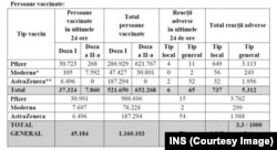 45.184 de persoane au fost vaccinate în ultimele 24 de ore, din care 71 au înregistrat reacții adverse (0,15%), arată datele Institutului Național de Sănătate Publică (INSP). De la începutul campaniei cele mai multe reacții adverse s-au înregistrat la AstraZeneca- 187.294 persoane au primit ambele doze de vaccin, fiind semnalate 1.988 de reacții adverse (1,06%).