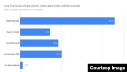 La întrebarea care este cea mai bună soluție pentru rezolvarea situației actuale cei mai mulți consideră că soluția o reprezintă alegerile anticipate – 45.8%. Celelalte variante pentru care s-a optat sunt: guvern minoritar – 14.4%, guvern tehnocrat 18.5%, un nou guvern PSD 20.1%.