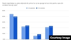 În situația în care Klaus Iohannis și Dan Barna ar ajunge în turul al doilea al prezidențialelor 39.8% l-ar prefera pe actualul președinte, iar 24% pe liderul USR, 8.8% nu ar merge la vot, iar 23.2% nu știu în acest moment ce ar face. În sondajul celor de la USR, Iohannis era cotat cu 44.2% intenție de vot pentru turul doi în luna septembrie, iar Dan Barna cu 22.2%.