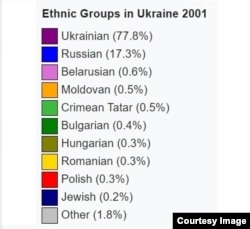 Cel mai mare grup etnic era al rușilor, care reprezintă 17,3% din populația totală a Ucrainei. Procentul românilor era de 0,3%, iar al modovenilor de 0,5%.