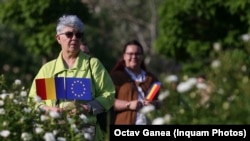 Manifestanții, copii, tineri și adulți, deopotrivă, poartă steaguri europene și ale României.