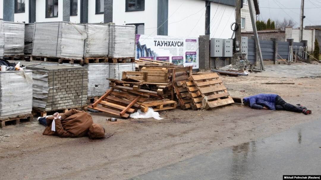 Trupurile neînsuflețite a două persoane pe o stradă din Bucea, la 60 de km de Kiev. Localnicii spun că cei doi civili au fost uciși de soldații ruși. Reuters, 3 aprilie, 2022.